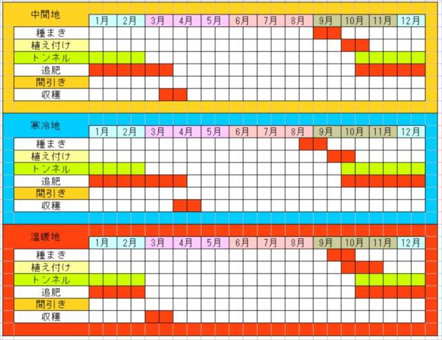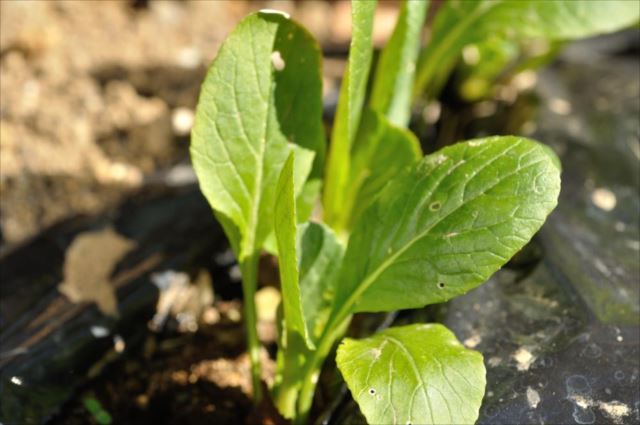 畝幅60cm~70cmくらいに条播きして栽培します。一般的に、成長とともに間引きして栽培していきます。